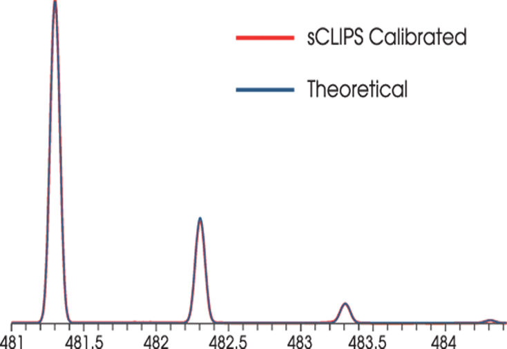 MassWorks軟件的sCLIPS通過(guò)將質(zhì)譜的線形校正為可用數(shù)學(xué)表達(dá)的函數(shù),地解決了這個(gè)問(wèn)題,可以利用譜圖準(zhǔn)確度值,非常地對(duì)比校正譜圖與理論譜圖,實(shí)現(xiàn)未知離子分子式的識(shí)別。sCLIPS充分利用了未知離子的單同位素峰與其它同位素峰很好分離的特點(diǎn),不需要使用內(nèi)標(biāo)或外標(biāo),直接得到測(cè)量的峰形函數(shù),通過(guò)MassWorks產(chǎn)生單同位素峰的線形校正函數(shù),并將其應(yīng)用到離子的整個(gè)同位素輪廓。這個(gè)線形校正譜圖,能夠可視和定量地與用相同的線形函數(shù)計(jì)算得到的理論譜圖進(jìn)行比較。得到的譜圖準(zhǔn)確度值提供了準(zhǔn)確和強(qiáng)大的計(jì)量工具,能從質(zhì)量得到的長(zhǎng)長(zhǎng)可能分子式列表中得到正確的分子式。