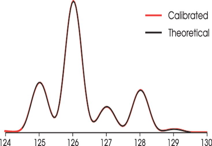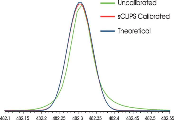 CLIPS搜索后4-氯甲苯(C7H7Cl,名義質(zhì)量為126 Da)的譜圖疊加。MassWorks正確識(shí)別了這個(gè)化合物,譜圖準(zhǔn)確度為99.5%,質(zhì)量精度為9 ppm,盡管在125 Da存在M-H的干擾離子,這也是GC/MS中的常見(jiàn)問(wèn)題,但通過(guò)MassWorks的混合搜索工具,這個(gè)問(wèn)題很容易解決。 針對(duì)高分辨質(zhì)譜的解決方案 對(duì)于高分辨質(zhì)譜,不需要標(biāo)準(zhǔn)物校正,根據(jù)校正的同位素輪廓,利用MassWorks的sCLIPS(自校正線(xiàn)形同位素輪廓搜索)提高儀器的分子式識(shí)別能力,增強(qiáng)未知物識(shí)別的置信度。另外,也緩解了高分辨質(zhì)譜為追求質(zhì)量測(cè)定,而頻繁、耗時(shí)的校正工作。 圖表為依米丁(Emetine)在TOF測(cè)定后的校正結(jié)果: