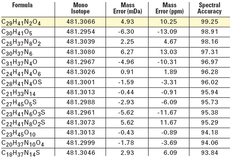 來(lái)自TOF儀器,并根據(jù)譜圖準(zhǔn)確度排列得到的依米丁(C29H41N2O4+)的搜索列表(利用C、H、N、O和S元素搜索得到的179個(gè)分子式)。表明MassWorks的sCLIPS很容易識(shí)別小到千分之幾的譜圖差異,這個(gè)結(jié)果對(duì)于未經(jīng)線(xiàn)形譜圖校正是不可能實(shí)現(xiàn)的。同時(shí)注意到,儀器盡管沒(méi)有很好的校正,譜圖準(zhǔn)確度在質(zhì)量精度超過(guò)10 ppm時(shí),也很容易實(shí)現(xiàn)正確的分子式識(shí)別。 ——MassWorks讓質(zhì)譜變得更好!