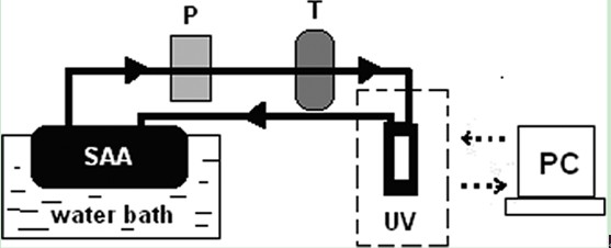 圖1 在線紫外分光光度法分析系統(tǒng)示意圖,P為二元泵,流速20ml/min.T為溫度控制系統(tǒng).PC為光譜采集的工作站.水浴設(shè)置不同的溫度如表1所示。