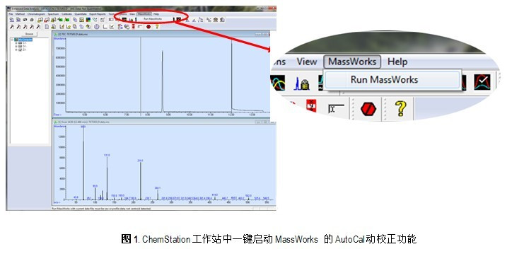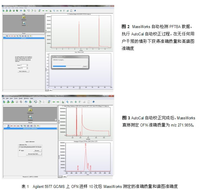 在新的MassWorks 4.0版本中,一個(gè)全新的功能叫做AutoCal?,它被直接嵌入至Agilent GC/MS系統(tǒng)的ChemStation工作站中。在ChemStation工作站下只需一鍵操作MassWorks選項(xiàng)(圖1)即可自動(dòng)執(zhí)行AutoCal?,MassWorks自動(dòng)調(diào)用全氟三丁胺(PFTBA)數(shù)據(jù)(圖2)對(duì)MS的質(zhì)量軸和質(zhì)譜峰形進(jìn)行全面校正,保證GC/MS能夠獲得幾個(gè)mDa以內(nèi)的質(zhì)量偏差以及97%以上的譜圖準(zhǔn)確度,讓GC/MS能自動(dòng)獲取色譜流出組分的準(zhǔn)確質(zhì)量(圖3),并對(duì)分子式做出準(zhǔn)確測定。