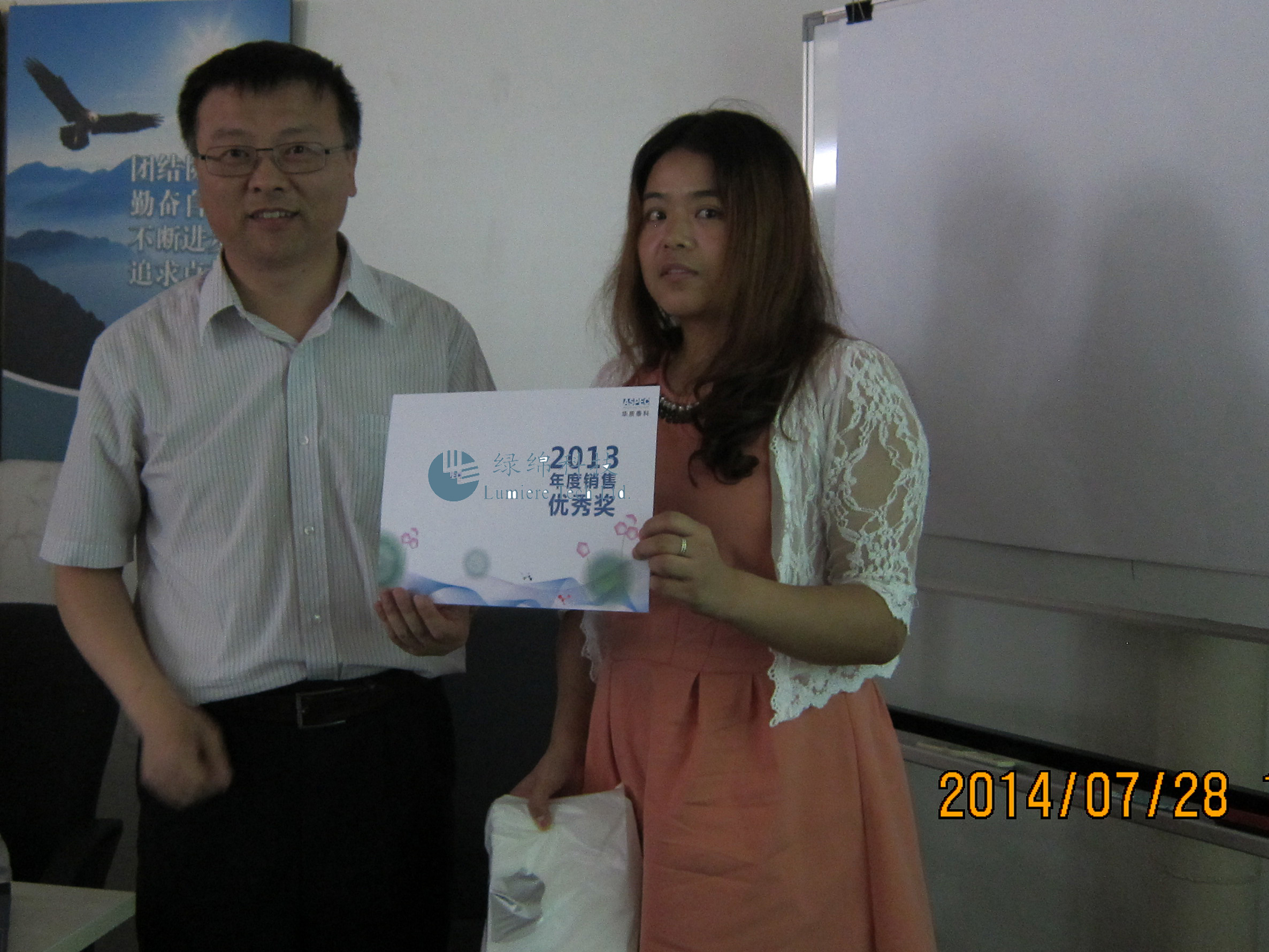 2014年7月28-29日,綠綿科技鄭州、杭州、西安、上海辦事處銷售集中在北京進行半年總結(jié),歐陽偉民總經(jīng)理總結(jié)上半年業(yè)績,并對2013年新產(chǎn)品推廣者補發(fā)廠家贈送的iPad獎品,對2014年新產(chǎn)品推廣達標員工進行獎品發(fā)放。綠綿科技對銷售產(chǎn)品進行培訓(xùn)總結(jié)、考核,大家增強了信心。