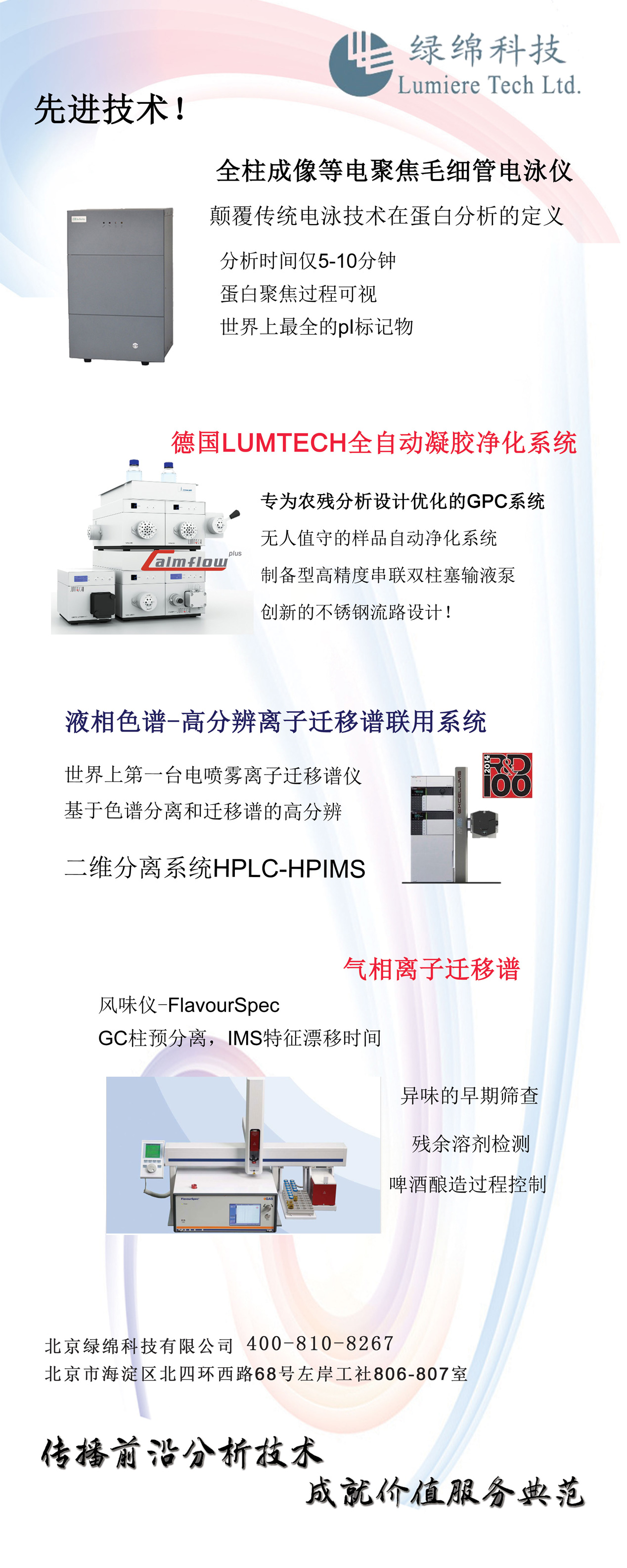 三、綠綿科技在2014第三屆環(huán)渤海區(qū)域色譜質(zhì)譜學(xué)術(shù)會(huì)議展出新產(chǎn)品和技術(shù):綠綿科技代理的新一代毛細(xì)管全柱成像電泳儀顛覆了蛋白分析的定義,創(chuàng)新的全不銹鋼設(shè)計(jì)的樣品全自動(dòng)凝膠凈化前處理設(shè)備ECO plus GPC是專為農(nóng)殘?jiān)O(shè)計(jì)的,HPLC-HPIMS液相離子遷移譜儀是R&D1000獎(jiǎng)獲得者,FlavourSpec風(fēng)味儀可以快速測(cè)定VOCs。