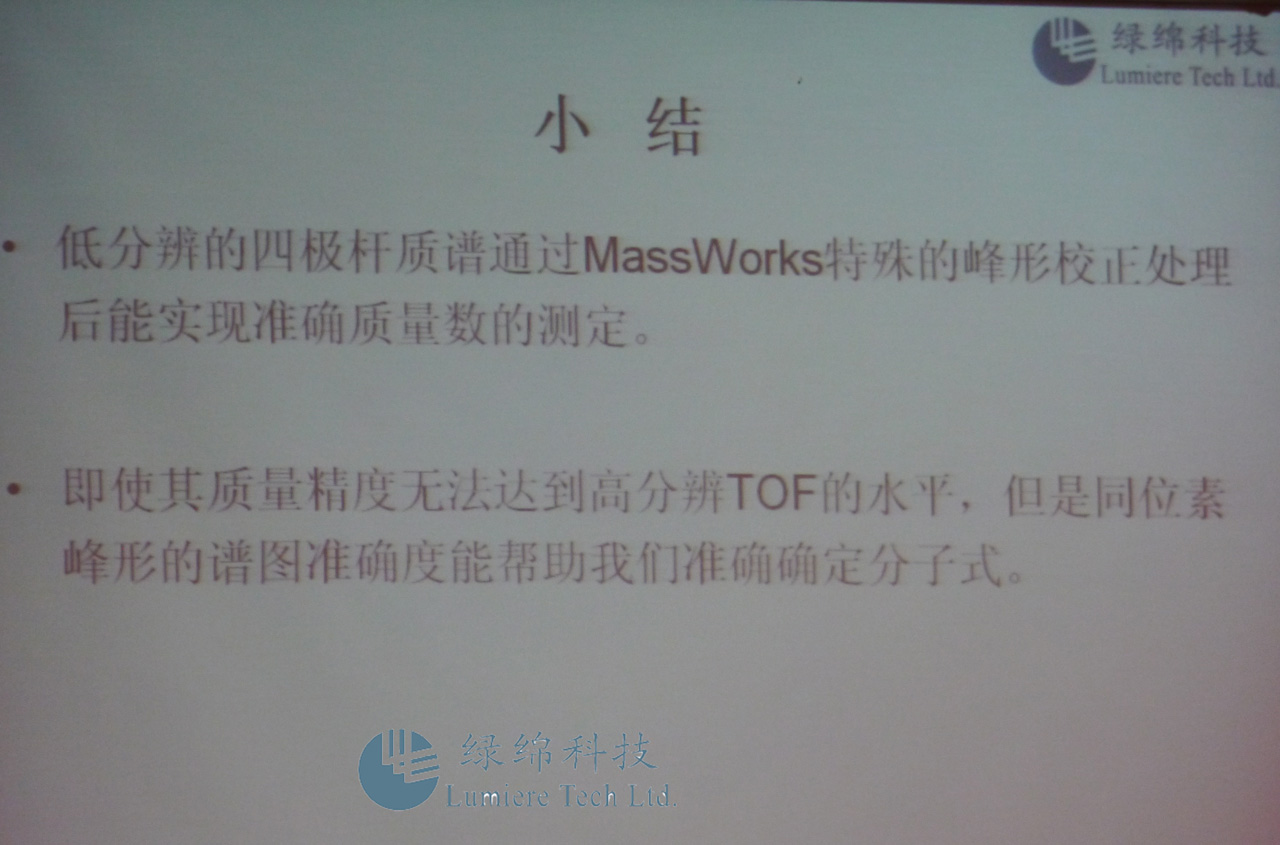 綠綿科技積極參與2104有機(jī)質(zhì)譜學(xué)術(shù)會議,在學(xué)刊上發(fā)表文章,技術(shù)工程師李斌在大會做分會報(bào)告,以氣質(zhì)和液質(zhì)聯(lián)用測試數(shù)據(jù)表達(dá)如何在單位質(zhì)量分辨質(zhì)譜儀上通過準(zhǔn)確質(zhì)量確定化合物的元素組成,一是四極桿LC/MS上化合物準(zhǔn)確質(zhì)量和元素組成的確定,二是單四極桿GC/MS上共流出物的鑒定,測試表明低分辨的四極桿質(zhì)譜通過MassWorks特殊的峰形校正處理后能實(shí)現(xiàn)準(zhǔn)確質(zhì)量數(shù)的測定,即使其質(zhì)量精度無法達(dá)到高分辨TOF的水平,但是同位素峰形的譜圖準(zhǔn)確度能幫助我們準(zhǔn)確確定分子式。