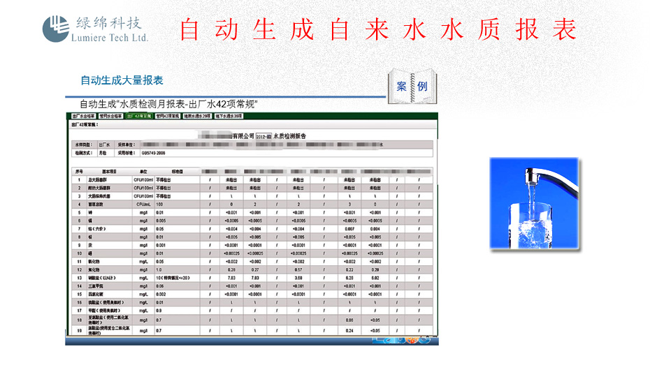 自來(lái)水供應(yīng)企業(yè)水質(zhì)檢測(cè)中心客戶面臨的挑戰(zhàn),(1)水質(zhì)檢測(cè)中心的工作是每月對(duì)各水廠進(jìn)廠原水、出廠水、有代表性的管網(wǎng)水進(jìn)行全分析檢測(cè);每半個(gè)月對(duì)全市82個(gè)管網(wǎng)監(jiān)測(cè)點(diǎn)進(jìn)行簡(jiǎn)項(xiàng)分析;對(duì)出廠水水質(zhì)不定期抽查。通過(guò)對(duì)檢測(cè)過(guò)程中發(fā)現(xiàn)的水質(zhì)問(wèn)題及時(shí)報(bào)告和處理。所以,數(shù)據(jù)需要及時(shí)匯總統(tǒng)計(jì)及報(bào)送。(2)檢測(cè)項(xiàng)目比較固定,但一次抽檢項(xiàng)目很多(常規(guī)42項(xiàng),非常規(guī)還有幾十項(xiàng)),幾十個(gè)監(jiān)測(cè)點(diǎn),還要分地下水、地表水、管網(wǎng)水等。(3)抽檢后,要形成大量的日?qǐng)?bào)、周報(bào)、月報(bào),以前是畫在一張大表上,手工填寫,后再報(bào)送,需要大量的精力去謄寫結(jié)果和校對(duì)。(4)需要軟件,尤其是統(tǒng)計(jì)和報(bào)表功能比較強(qiáng)大的軟件。(5)經(jīng)費(fèi)有限;要求實(shí)施周期快。