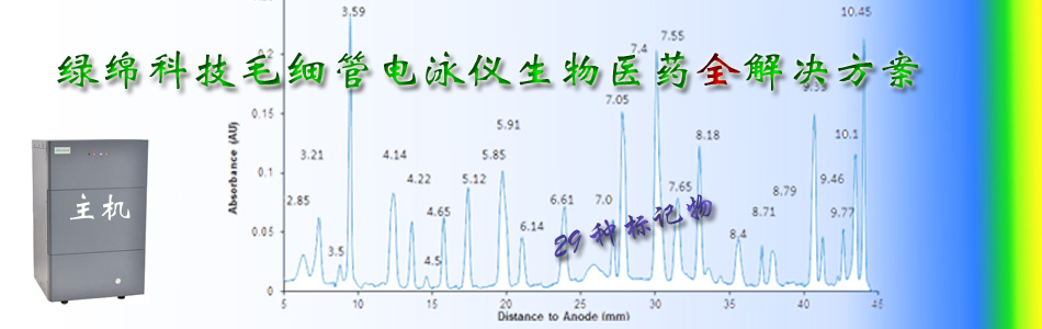 全柱成像等電聚焦毛細(xì)管電泳技術(shù)(cIEF -WCID), 徹底顛覆了傳統(tǒng)電泳技術(shù)在蛋白質(zhì)分析中的定義。通過(guò)cIEF-WCID技術(shù),復(fù)雜蛋白質(zhì)的分離和pI點(diǎn)的測(cè)定變得異常輕松:高分辨率、高效分離、準(zhǔn)確pI 點(diǎn)測(cè)定和超高分析通量,成為蛋白質(zhì)藥物、抗體藥物研發(fā)、質(zhì)量控制、蛋白質(zhì)組學(xué)基礎(chǔ)研究和生物相互作用機(jī)制探索的強(qiáng)有力工具。綠綿科技攜毛細(xì)管電泳儀主機(jī)、多種消耗品、技術(shù)力量和強(qiáng)大的售后服務(wù)為廣大用戶(hù)提供全面的解決方案。