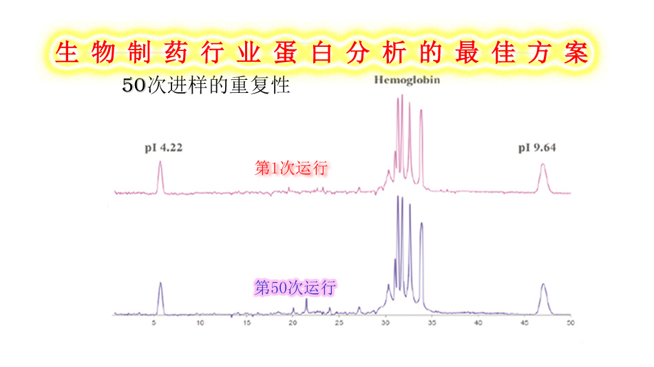 全柱成像等電聚焦毛細(xì)管電泳儀徹底顛覆了傳統(tǒng)電泳技術(shù)的一個(gè)重要優(yōu)勢(shì)是高度的重復(fù)性,連續(xù)50次進(jìn)樣重復(fù)性基本一致是傳統(tǒng)電泳技術(shù)無(wú)法得到,重復(fù)性不好是電泳工作者的困擾。