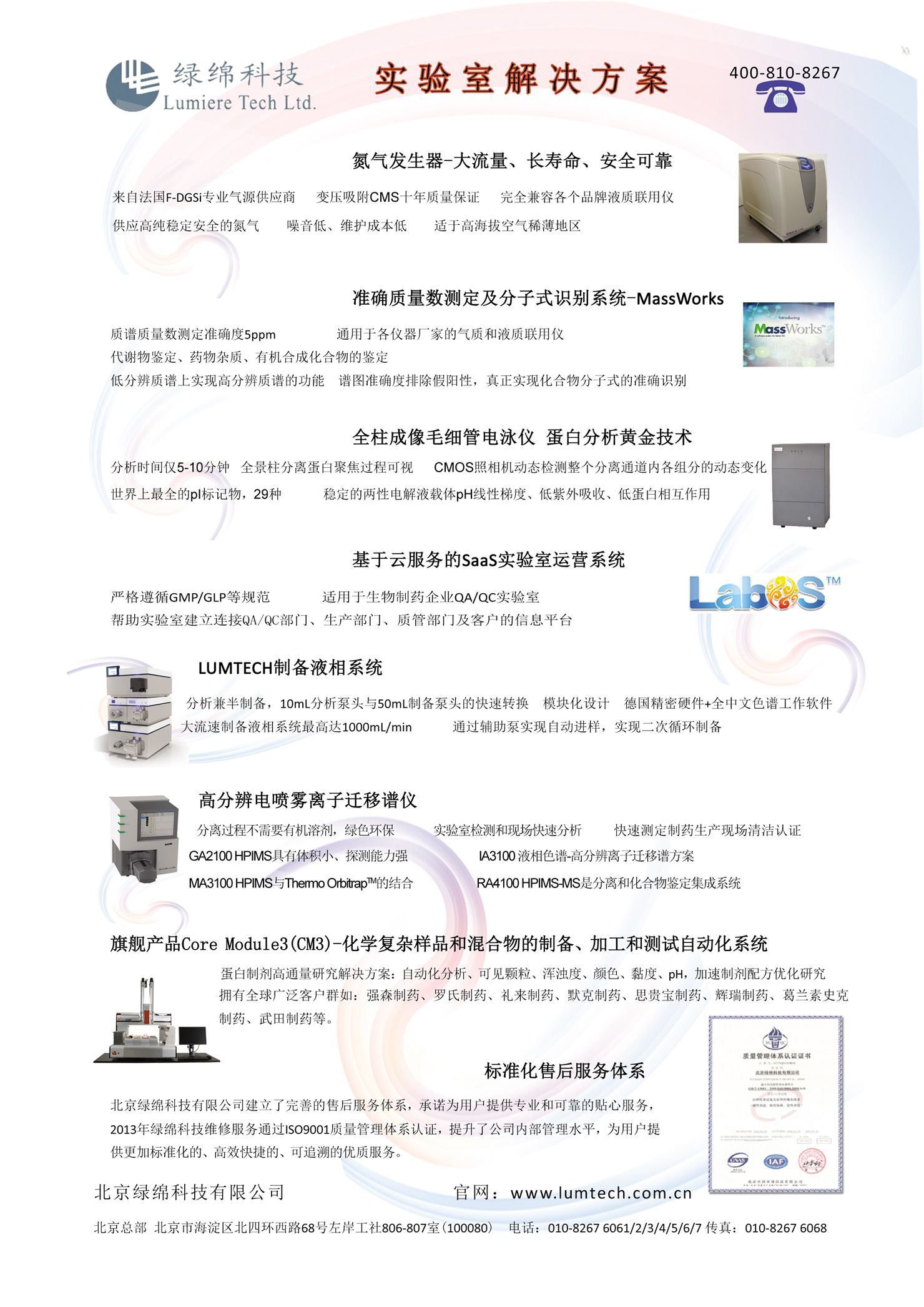 北京綠綿科技有限公司(簡稱:綠綿科技)成立于2001年,以體現客戶服務高價值為宗旨,以專業(yè)精神和技能為廣大實驗室分析工作者提供樣品前處理、樣品制備及分析、實驗數據分析和管理的全面解決方案,致力于協(xié)助客戶提高分析檢測的效率和水平。主要代理產品有LabOS實驗室運營系統(tǒng)、Lumtech半制備/制備液相色譜、MassWorks準確質量測定及分子式識別、New Objective納噴離子源、GE生命科學設備、凝膠凈化前處理、氣相離子遷移譜、電噴霧離子遷移譜、全柱成像毛細管等電聚膠電泳儀、實驗室氮氣、氫氣、空氣發(fā)生器、Agilent中端產品。服務熱線:400-810-8267,郵箱:info@lumtech.com.cn。