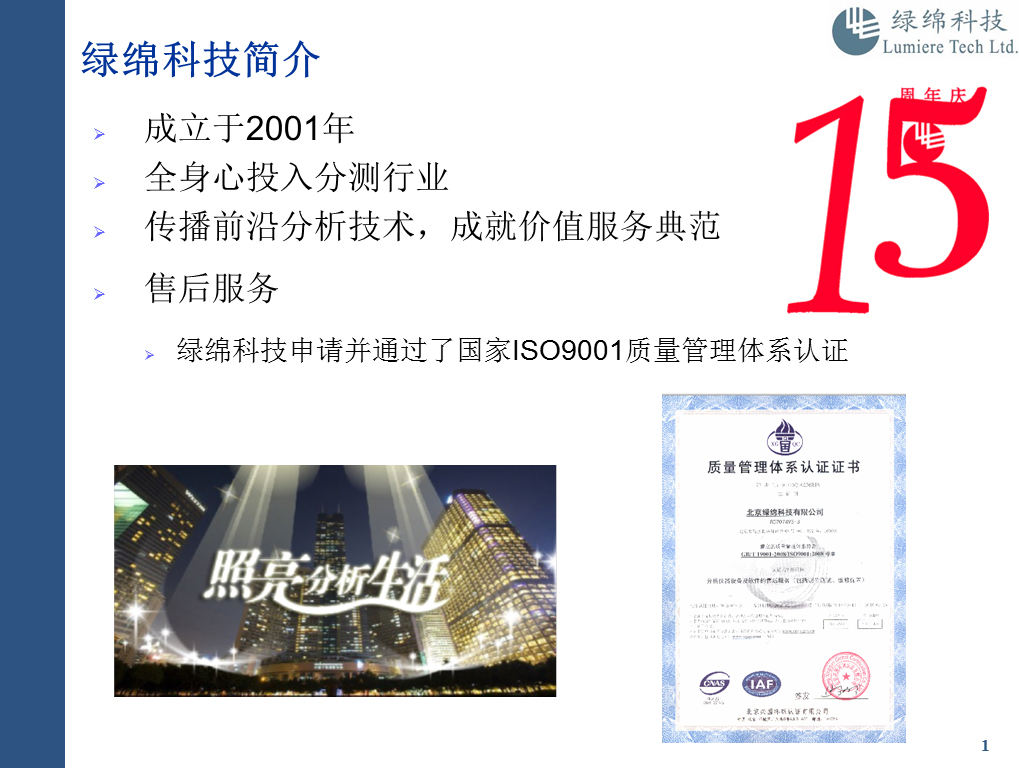 綠綿科技成立于2001年,致力于為實驗室分析測試提供服務(wù)為己任,用專業(yè)精神和技能服務(wù)于中國眾多客戶,協(xié)助客戶提高分析檢測的效率和水平,綠綿科技的愿景是傳播前沿分析技術(shù),成就價值服務(wù)典范。2016年迎來綠綿科技成立15周年,歡迎繼續(xù)關(guān)注綠綿科技并參與綠綿科技周年系列活動中,有優(yōu)惠促銷,有周年紀(jì)念品。