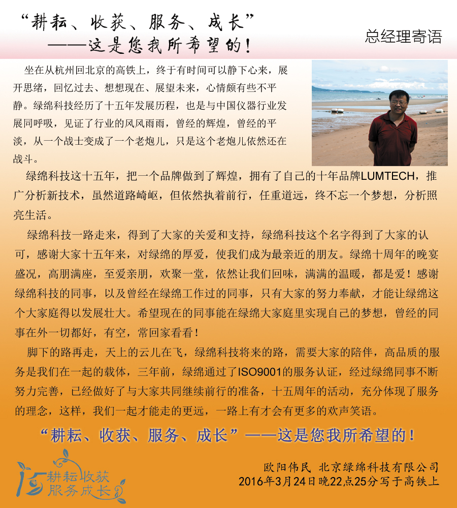 綠綿科技總經(jīng)理歐陽偉民感言,綠綿十五周年“耕耘收獲,服務(wù)成長”--這是您我所希望的!