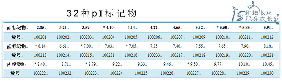 pI標記物經(jīng)過已知pKa物質(zhì)校正,保證pI標記物的準確,適用于各種特性蛋白pI值的準確測定。pI標記物具有pI范圍寬(2.8-11)、抗酶解、純度高、穩(wěn)定性高、壽命長的特點。