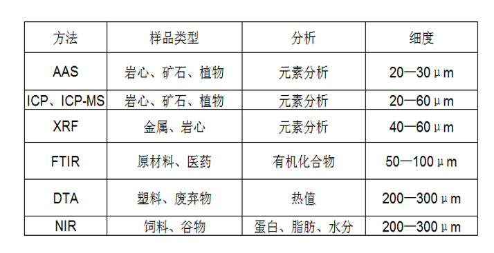 大多數(shù)消解方法中,樣品顆粒太細(xì),消解反應(yīng)太快影響結(jié)果。太粗會(huì)需要更多時(shí)間去消解,加更多酸試劑。顆粒大小與相關(guān)萃取方法也有重要聯(lián)系。顆粒太大部分物質(zhì)無法萃取得到,如果顆粒太小,萃取管會(huì)堵塞,樣品會(huì)迅速導(dǎo)入燒杯中。佳的樣品細(xì)度依賴所使用的的萃取裝決定。大多數(shù)設(shè)備需要500μm左右為佳條件,不同分析方法要求適量的樣品顆粒大小,如下表: