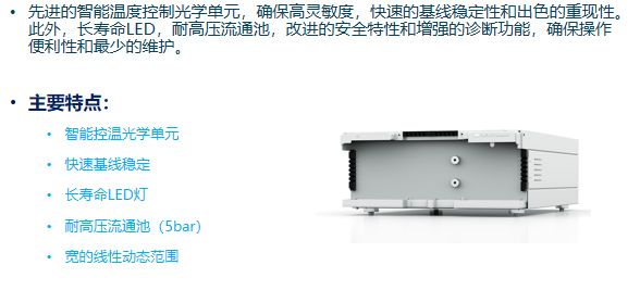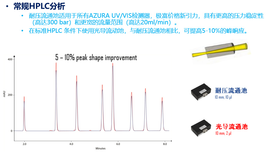 AZURA® 采用波長190-700nm的DAD 2.1L二極管陣列檢測器,搭配高靈敏度的分析流通池以適應(yīng)不同的檢測需求,如用于常規(guī)HPLC分析的耐壓流通池和標(biāo)準(zhǔn)型光導(dǎo)流通池,用于UHPLC分析的高靈敏度光導(dǎo)流通池等。