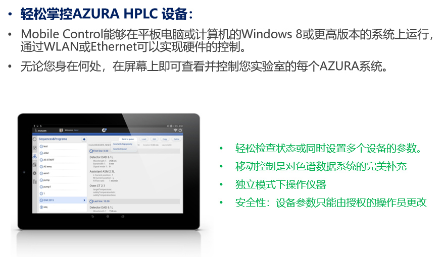 AZURA系統(tǒng)可搭載KNAUER設(shè)計的Mobile Control,通過 WLAN或 Ethernet可以實現(xiàn)硬件的控制和監(jiān)視。無論您身在何處,在屏幕上即可查看并控制您實驗室的每個AZURA系統(tǒng)。