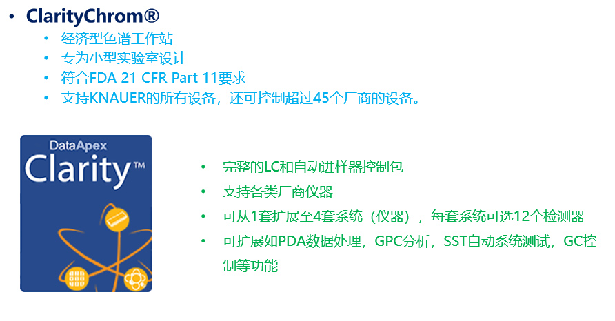 ClarityChrom®是一款用于儀器控制、數(shù)據(jù)采集和數(shù)據(jù)處理的功能強(qiáng)大且簡單易用的色譜工作站軟件。ClarityChrom 支持KNAUER的所有設(shè)備,還可控制超過45個廠商的設(shè)備。