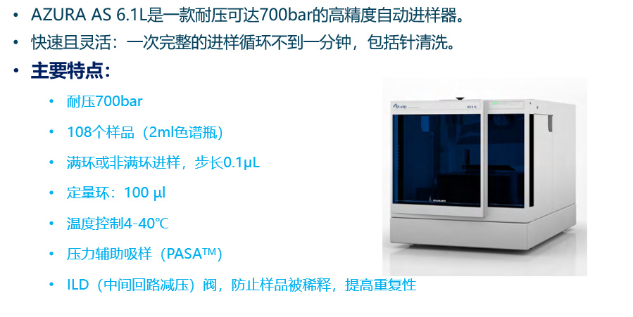 AZURA AS 6.1L 是一款高性能的進(jìn)樣器,進(jìn)樣速度快,單次進(jìn)樣時間小于1分鐘,包括進(jìn)樣針清洗時間。配置108位標(biāo)準(zhǔn)2ml小瓶的樣品盤。頂空壓力補(bǔ)償功能可以防止吸樣時產(chǎn)生氣 泡,確保進(jìn)樣的準(zhǔn)確。特殊設(shè)計的中間回路減壓(ILDTM)技術(shù),可避免樣品被溶劑稀釋。