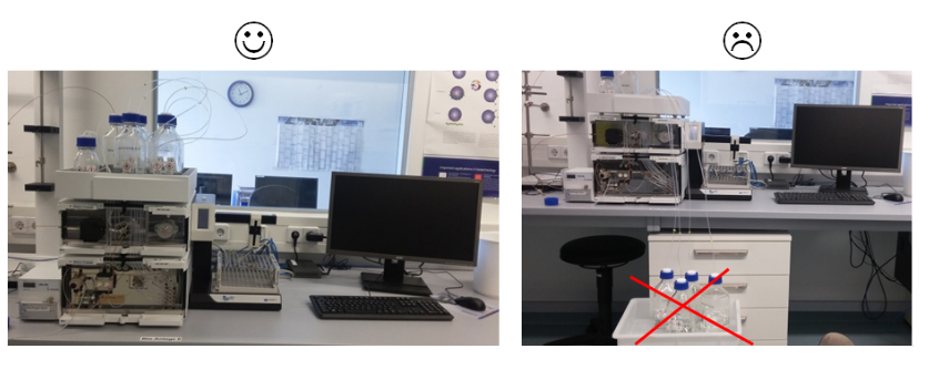 用于緩沖液,洗脫液和樣品的瓶子必須布置在泵的上方或旁邊。否則泵將難以泵送淋洗液。使用我們的洗脫液托盤(AZZ00),可以放在AZURA液相的上面。
