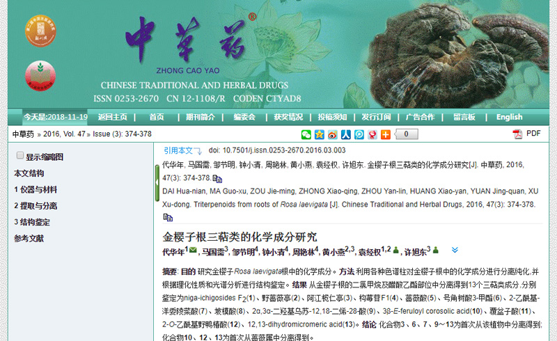 金櫻子Rosa laevigata Michx是薔薇科(Rosaceae)薔薇屬Rosa L. 的傳統(tǒng)藥用野生植物,含有多種營(yíng)養(yǎng)成分,其中主要的活性成分是多糖、黃酮類、三萜類及其衍生物等。金櫻子的果實(shí)有固精、澀腸、縮尿、止瀉等功能,主治滑精、遺尿、尿頻、高血壓等,并對(duì)防止實(shí)驗(yàn)性的動(dòng)脈粥樣硬化有一定的功效。化合物10、12、13為首次從薔薇屬中分離得到。
