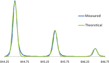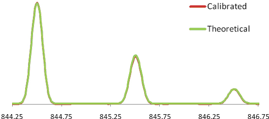 圖2. 譜圖準確度是度量測量的同位素峰簇譜形(離子譜圖)與理論的離子譜圖相似程度的工具,沒有經(jīng)過合適的線性輪廓校正,光譜準確度用于識別未知物的分子式大大受到限制 圖3. MassWorks軟件將譜圖校正為線性輪廓圖,也校正了質(zhì)量軸位置,利用譜圖準確度可以高精度的對比校正后譜圖和理論譜圖,譜圖準確度可高達99.9%以上。對于高分辨儀器可以提高其分子式識別能力,當結(jié)合MassWorks校正后得到的高質(zhì)量準確度,使其能夠在單位分辨的GC和LC/MS的四極桿儀器上實現(xiàn)分子式識別