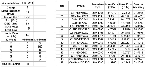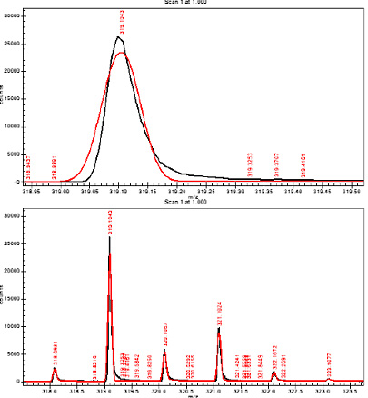 圖3. 感興趣離子的原始(黑色)和峰形校正后(紅色)質(zhì)譜圖(頂圖 -- 單同位素峰;底圖 -- 包含可能M-H離子的完全同位素輪廓) 表1顯示了sCLIPS分子式測定參數(shù)和結(jié)果,需要注意的是,可能存在的M-H構(gòu)形用于混合搜索,MassWorks 2.0的一個(gè)新特點(diǎn)能處理三個(gè)相關(guān)的干擾離子,相應(yīng)地,譜圖準(zhǔn)確度工具現(xiàn)在能夠計(jì)算相對(duì)于319.1043 Da測定質(zhì)量,從-1.5 Da到4.5 Da的質(zhì)量范圍,因此覆蓋了可能干擾離子的全部同位素輪廓??偣?span lang="EN-US">70種不同分子式滿足±10 mDa的質(zhì)量偏差(見表1),正確的分子式C17H20N2SCl ,顯示了97.27%的高譜圖準(zhǔn)確度.