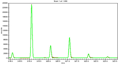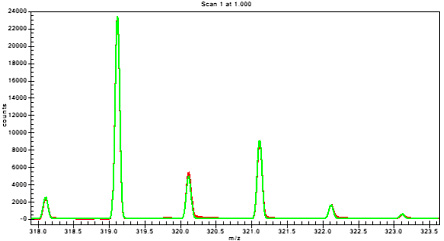 圖5顯示了校正后譜圖與排名第二分子式(C15H24O3SCl )的譜圖匹配,該分子式僅有15個(gè)碳,譜圖準(zhǔn)確度為96.52%,顯示在320 Da峰上的輕微不同,再一次表說明了用已知峰形函數(shù)對(duì)真正同位素輪廓建模的重要性。有趣的是,在表1的可能分子式列表中,排在頂部的待選分子具有氮元素,說明這種疊加質(zhì)譜圖能作為分子式可能元素檢測的有效工具用。