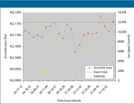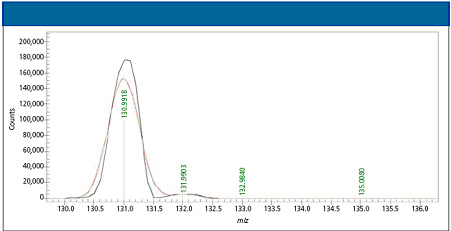 雖然這里使用的單四極桿GC-MS系統(tǒng),在一周測試期間只有7 mDa或162 Da超過50 ppm的質(zhì)量波動,但對于傳統(tǒng)的質(zhì)量測定元素組成會造成很大偏差,在一周的測試期間,反應(yīng)質(zhì)譜線形譜圖的質(zhì)量準(zhǔn)確度保持不變,不需重新校正就能不斷地進(jìn)行分子式的可靠測定。