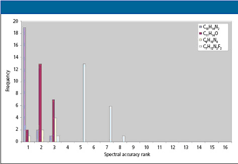 圖3. 報(bào)告的質(zhì)量準(zhǔn)確度、單同位素峰離子強(qiáng)度和已知m/z 162 Da的真實(shí)質(zhì)量數(shù) 正象文獻(xiàn)[6]報(bào)道,當(dāng)質(zhì)量準(zhǔn)確度作為分子式識別的重要工具時(shí),通常只識別給定同位素離子的單一同位素峰,由于這個(gè)原因,即使具有1-2 ppm質(zhì)量精度的高分辨質(zhì)譜,在測量的很小質(zhì)量誤差內(nèi),也有很多待選分子式的單一同位素質(zhì)量落在這個(gè)范圍內(nèi)。譜圖準(zhǔn)確度,一個(gè)獨(dú)立計(jì)量工具,可以計(jì)量測定譜圖與計(jì)算的理論譜圖匹配程度,它包含給定離子更多的同位素分布精細(xì)結(jié)構(gòu)信息,是比質(zhì)量準(zhǔn)確度更重要的信息。另外,由于代表質(zhì)譜儀器線形譜圖的譜圖準(zhǔn)確度不容易受質(zhì)譜波動影響,所以譜圖準(zhǔn)確度相對質(zhì)量準(zhǔn)確度是更可靠的分子識別工具。 162 Da的未知離子,質(zhì)量誤差超過50 ppm(表I和圖3)提供了很好的例子,說明譜圖準(zhǔn)確度相對質(zhì)量準(zhǔn)確度的相對重要性和可靠性。以162 Da離子為未知物,在通常元素C、H、N、O、F和Cl范圍內(nèi)進(jìn)行元素組成搜索,全部22次質(zhì)譜測量利用軟件對這個(gè)離子進(jìn)行處理測定它們的分子式,根據(jù)譜圖準(zhǔn)確度排名,分子式C10H14N2排名位有19次,兩次排在第二位,一次排在第三位(圖4),這個(gè)分子式后來證明是正確的分子式(煙堿),排名第二和三的測量均為樣品濃度較低的情況下得到。