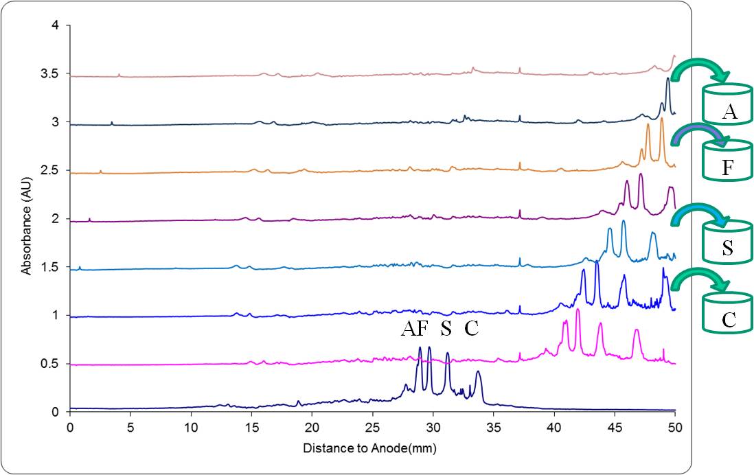 5) 全柱成像檢測(cè)應(yīng)用于毛細(xì)管等電聚焦,可以取消樣品聚焦區(qū)帶的移動(dòng)步驟,充分保持毛細(xì)管等電聚焦的高分離柱效和高分辨率